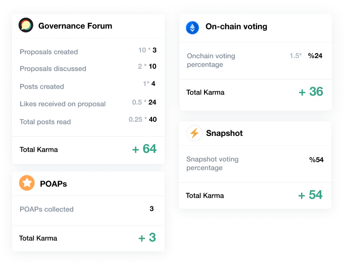 Along with reputation leaderboard, Karma also generates profiles for all DAO delegates. These profiles act as auto generated resumes showing their activity across all the tools.