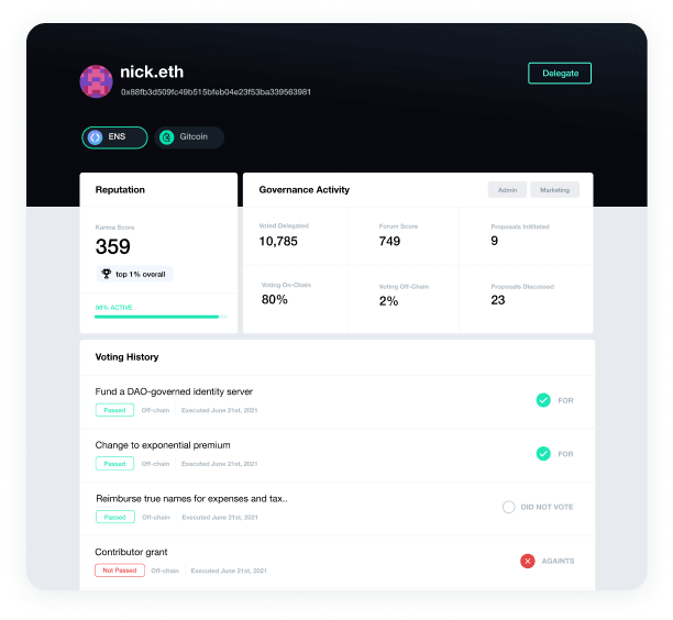 Delegates can share their profile with token holders to let them delegate their tokens or share with other DAOs they are interested in joining to prove their skills.